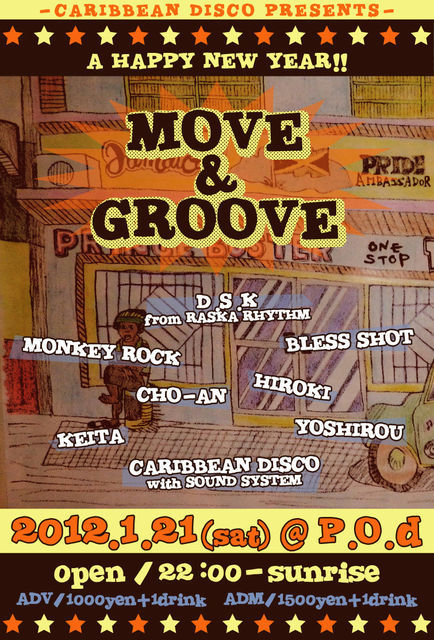 管理人様告知失礼致します! 2012年からCARIBBEAN DISCOが新たにお届け致します! ★MOVE&GROOVE★ レアチューンから定番チューン! SKA,ROCKSTEADY,REGGAE,LOVERSからDANCEHALL CLASSICまで! 時にはR&R! そして、サウンドシステムを導入します! 朝まで全員で踊りましょう! -CARIBBEAN DISCO PRESENTS- ★MOVE&GROOVE vol.1★@P.O.d -SKA,ROCKSTEADY,LOVERS,DANCEHALL- 2012.01.21(SAT) 22:00-EARLY MORNING ADV/1000yen ADM/1500yen ※入場時別途1D(500yen)必要 -チケットメール予約- info@caribbea