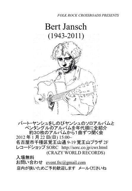 2012年1月22日(日) 15:00〜 名古屋市千種区覚王山通9−19 覚王山プラザ2F レコードショップSORC 入場無料 バートの足跡をたどり、故人を偲びたいと思います。 とはいえ、バートヤンシュを聞いてみたい人も含め お気軽にお越し下さい。 12/9に奥様のLorenもガンで亡くなってしまいました。 彼女のアルバムも紹介しようと思います。