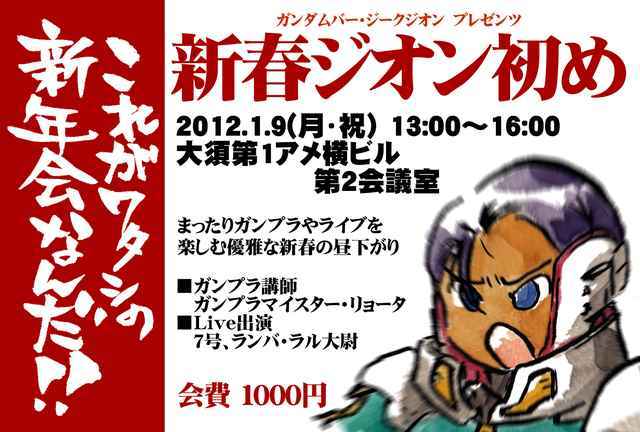 告知失礼致します。 名古屋大須SIEG ZEONの新年会です。 大須第1アメ横ビル4F第2会議室でガンプラ作ったりliveやりますよ。 ちょっとした料理とソフトドリンクは用意する予定です。 ガンプラ講師:リョータ先生 live出演:7号、ランバ・ラル大尉 会費1000円(お釣りがいらないようにお願いします)