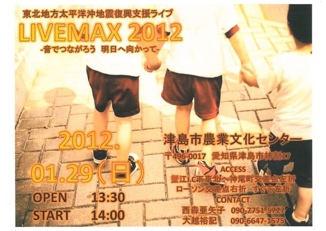 LIVEMAX 2011オールスター感謝祭、 LIVEMAX 2011夏祭り、 たくさんの復興支援募金、 たくさんの参加、 たくさんのご来場、 有り難う御座いました。 皆様のお陰で今回で3回目の開催になります。 まだまだ震災の影響は多く残り、 辛い日々を過ごしている方が たくさんみえるのが現状です。 小さな1人1人の力を大きな力に変えて 今回も音楽活動を通して 僕達の気持ちを届けようと思います。 1/29(日) 津島市農業文化センター内に、 13:30〜ライブ終了まで募金箱を設置しております。 入場無料、飲み物、食べ物も 全