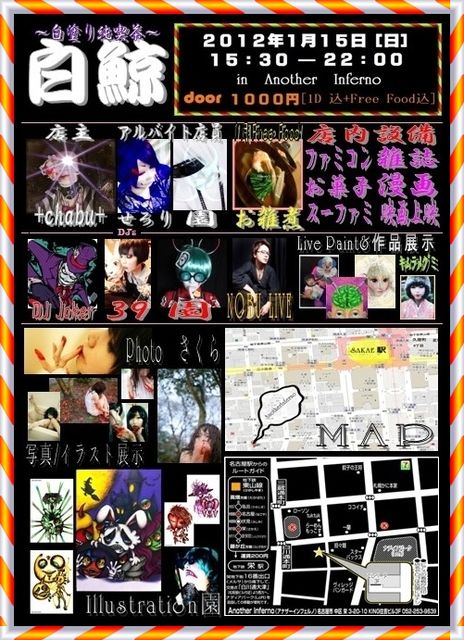 ■白塗り純喫茶 白鯨(はくげい)■ http://mixi.jp/view_community.pl?id=5458875 ---------------------------------------------------------------- 【開催日時】・1月15日(日曜) 15:30〜22:00 【開催会場】・Another Inferno(アナザーインフェルノ) 【開催場所】・名古屋市中区栄3丁目20-10 キング住吉ビル3F *Another Inferno* http://mixi.jp/view_community.pl?id=4971415 ■ Price ■ -Free Food有り- ・door :¥1000 (+1D付き) 1月のフリーフード ?お餅/お雑煮/ぜんざい 追