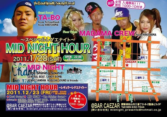 MID NIGHT HOUR 〜スペシャルレゲエナイト〜 2011/1/28(SAT) OPEN 22:00 - till morning @BAR CAEZAR 愛媛県松山市三番丁2-8-2豊島ビル3F Tell:089-932-7644 [当日] 女性1時までに入場したらFREE、 男性\1000-1D付き [Guest Sound] TA-BO from YELLOWHAWK [FLOOR VYBEZ] MADAMA CREW [Host Sound] MID NIGHT -The Shining Sound- [Sound] GENERAL BEAT、CANDY BOMB、KENDO SANDAN、KOBUSHI SOUND& friends・・・ [問い合わせ先] midnight_presents@hotmail.co.jp
