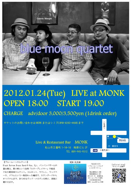 あの素敵な4人組がニューアルバム 「GOLDEN HITS〜ブルームーンカルテットのすべて〜」 を引っさげて愛媛に帰ってくる! 今年1月の西予市宇和町「池田屋」での熱いライブが蘇る! ブルームーンカルテットライブ、今年は松山MONKで開催! ご近所、お友達、ご家族みんなお誘いの上是非お越しください! 「GOLDEN HITS〜ブルームーンカルテットのすべて〜」リリースライブ @Live & Restaurant Bar MONK 愛媛県松山市三番町1-10-16 相原ビル2階 tel/ 089-945-9512 (地図はこちら http://bit.ly/rEAyj1 ) open/start 18:00/19:00 adv