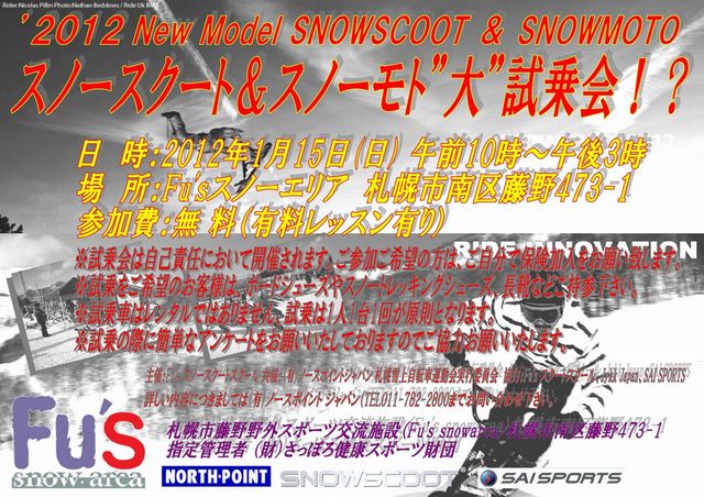恒例となりましたスノースクート&スノーモト試乗会を今年も「ノースポイント」さんのご協力のもと開催いたします。 現在スクートにお乗りの方は2012年のNewモデルに乗るチャンスです新しいのが欲しくなっても当コミュでは責任は持てませんよ 初めて乗ると言う方でも大丈夫インストラクターによるレクチャーをはじめ、試乗だけでは物足りないもっと乗ってみたいと言う方には1時間のレンタル付きの有料レッスン(プチレッスン)もやっています。 そして試乗会と同時に昨年もやりましたスノースクートクリニックも