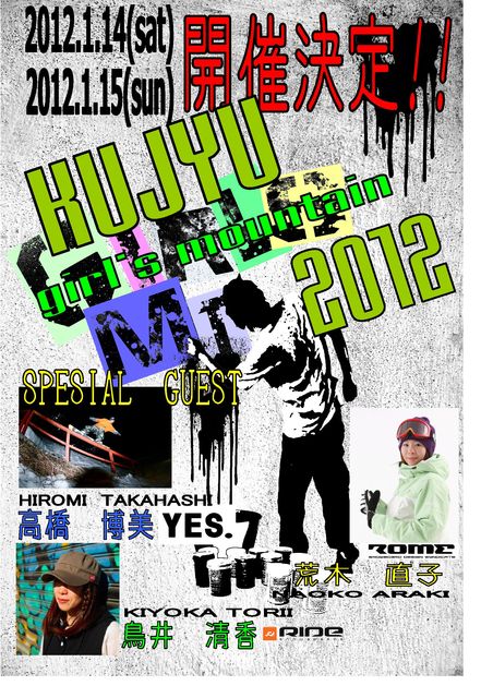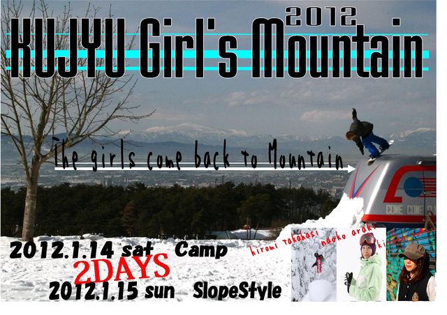 今回で3回目の開催!!! 〜KUJYU Girls Mt 2012 〜 14日キャンプ*コーチ:高橋博美(YES)荒木直子(ROME)鳥井清香(RIDE) 15日スロープスタイル大会 キャンプだけでも大会だけでも参加OK!!! どちらも初心者から参加できますよ〜 それぞれ申し込みは九重スキー場HPからダウンロードですきます。 〜キャンプ詳細〜 KUJYU Girls Mt CAMP 2012 全国で活躍するガールズライダーから特別レッスンを受けよう!! 雑誌や映像で大活躍の「高橋博美」「荒木直子」九州で活動する「鳥井清香」の3名に よるガールズ限定のBOX&JUMPレッ