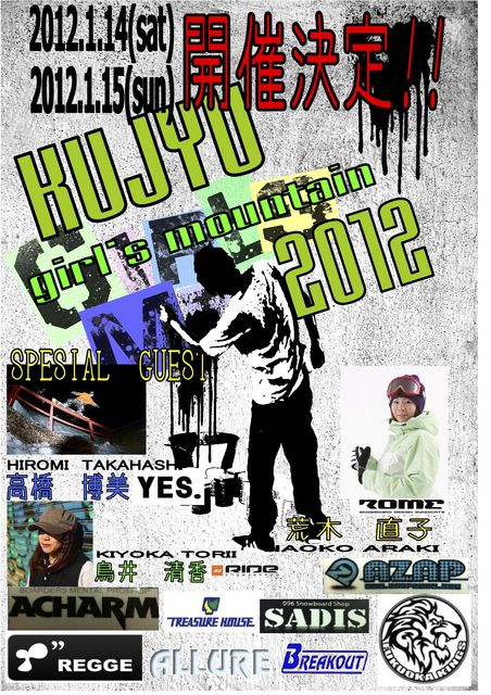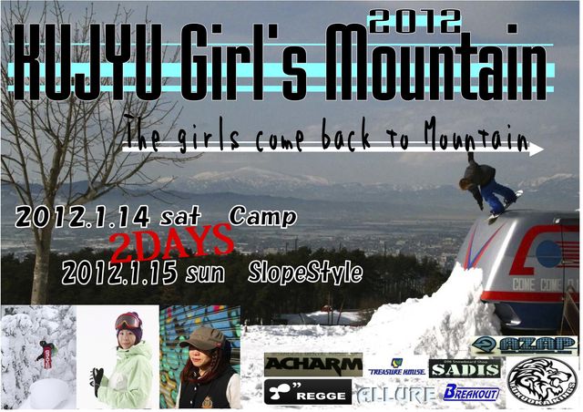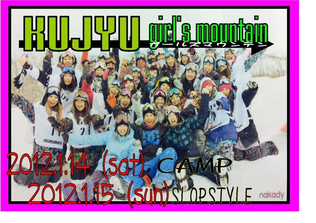 毎年開催されてます!ガールズスノーボーダーの為のキャンプ&大会です! 14日キャンプ(コーチは高橋博美(YES)荒木直子(ROME)鳥井清香(RIDE)) 15日スロープスタイル SADISで受付しています!この機会にチャレンジしてはどーでしょうか?? お急ぎ下さい!! KUJYU Girls Mt CAMP 2012 全国で活躍するガールズライダーから特別レッスンを受けよう!! 雑誌や映像で大活躍の「高橋博美」「荒木直子」九州で活動する「鳥井清香」の3名に よるガールズ限定のBOX&JUMPレッスンです。 日 時 : 2012.1月14日(土) 場 所 :