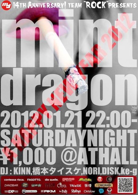 2012年で14周年を迎えた大分で最も歴史あるレギュラーロックDJイベント"ミントドラゴン"! 新年最初の開催は21日土曜日に決まりました♬ お時間あればぜひ! Team "ROCK" presents [mintdragon] 2012.1.21(sat) 22:00〜 @ATHALL http://www.athall.com Tel : 097-535-2567 入場料 1,000円 1ドリンクオーダー DJ : KINN, 橋本タイスケ, NORI, DISK, ke-g Web http://pastimedesignworks.com http://mintdragon-oita.blogspot.com Mail info@pastimedesignworks.com