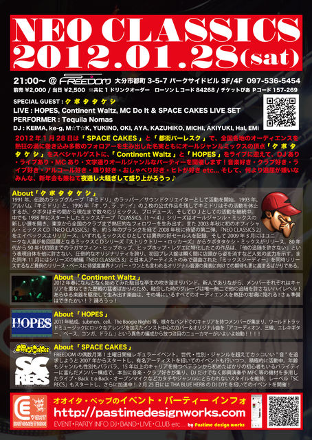 2012年1月28日は大分に、全国各地のオーディエンスを熱狂の渦に巻き込み多数のフォロアーを生み出した名実ともにオールジャンルミックスの頂点 「 ク ボ タ タ ケ シ 」をスペシャルゲストに、 「 Continent Waltz 」と「 HOPES 」をライブに迎えて、DJあり・ライブあり・MCあり・文字通りオールジャンルなパーティーを開催します!音楽好き・クラブ好き・ライブ好き・アルコール好き・踊り好き・おしゃべり好き・ヒトが好き etc... そして、何より退屈が嫌いなみんな、新年会も兼ねて夜通し大騒ぎして盛り上がろうっ♪ SPACE CAKES + 都街バーレス