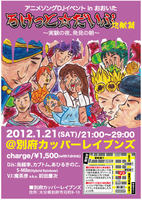 2012年、年明けからろけっとをぶっとばします!! 舞台は湯の町・別府で、今度はオールナイトイベント! ☆☆☆ ☆☆☆ ☆☆☆ アニメソングDJイベント in おおいた 『ろけっと☆だいぶ 地獄篇 〜実験の夜、発見の朝〜』 2012年1月21日(土)21:00〜29:00 ※ 20:30 open @別府カッパーレイブンズ(別府市元町8-10) ticket 1,500円(with 1 drink) DJs:烏龍李、カブトム、あひるきのこ、S-Mile(Hybrid Rainbow) VJ:魔茶彦 a.k.a. 前田慶次 「お前はいままで聴いたアニソンの曲数をおぼえているのか?」 2012