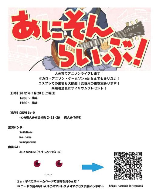 あけましておめでとうございます! 新年一発目のアニソンライブやります! 日程:2012年1月28日(土曜日) 場所:Dram Be-0 時間: 開場 16:30〜 開演 17:00〜 料金: 前売り券1200円 ですが、、、うちのバンドから購入すれば1000円になります! ※それと別途ドリンク代500円かかります 出演バンド: SmileHolic No-name Semoponume 出演DJ: あひるきのこ(ろけっと☆だいぶ) 昨年の11月6日に大分音楽館でやったアニソンライブの第二弾となります! 前回以上に盛り上がって行きたいと思いますのでもしよかったら皆さん参