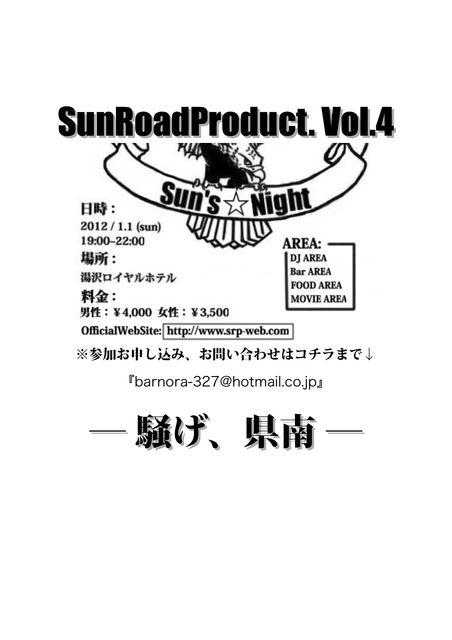 新管理人のトシボと申します☆さっそくイベントのお知らせです。 ホテルの会場をクラブと化した立食形式のパーティー。DJ・カクテルブースの設置。 「音と酒と若い力で秋田県南に爆発的な勢いを!」をコンセプトに結成された集団。若者の活気を取り戻すべく、季節に合わせたイベントを行っている。 8月14日には驚異の50人バーベキュー達成。10月29日のハロウィンパーティーでは店が揺れるほどの盛り上がりに。 (詳しくは下記URL参照http://www.srp-web.com) そして来たる1月1日。SRPが湯沢の夜にvol.4 「Sun's