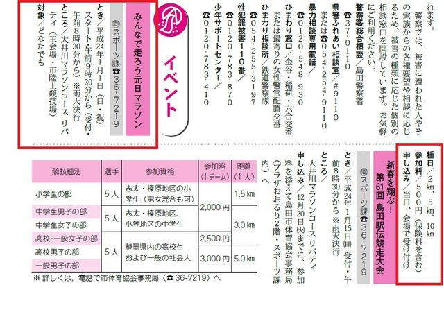 恒例のイベントです タイムスケジュール 受 付:午前8時30分〜 スタート:午前9時30分〜 ところ 大井川マラソンコース「リバティ」 集合場所は、島田市陸上競技場 対象 どなたでも 種目 2キロ・5キロ・10キロ 参加料 500円 申し込み 当日、会場受付