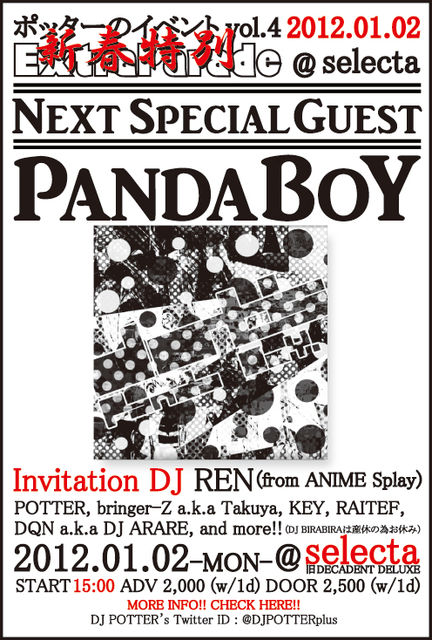 エレクトロ・ポップ、キラキラ・ハウス、極悪フィジットにダブステップ… 4つ打ち系の新たなエネルギーを感じさせる、歌って踊れるイベントとして誕生した 「ポッターのイベント」(通称ポタイベ) vol.4となる今回は、EXTRA PARADEの第2弾として、 スペシャルゲストにPandaBoYさんをお迎えして 新春特別編を明けましておめでとう開催します!!! また、PandaBoYさんスペシャルとしてイベント当日は 1:ドット柄 2:パンダの柄や小物 いずれかを着用でご来場の方には、ウェルカム御神酒を先着で振る舞います ♪(*^^)o∀*∀o(^^*)♪