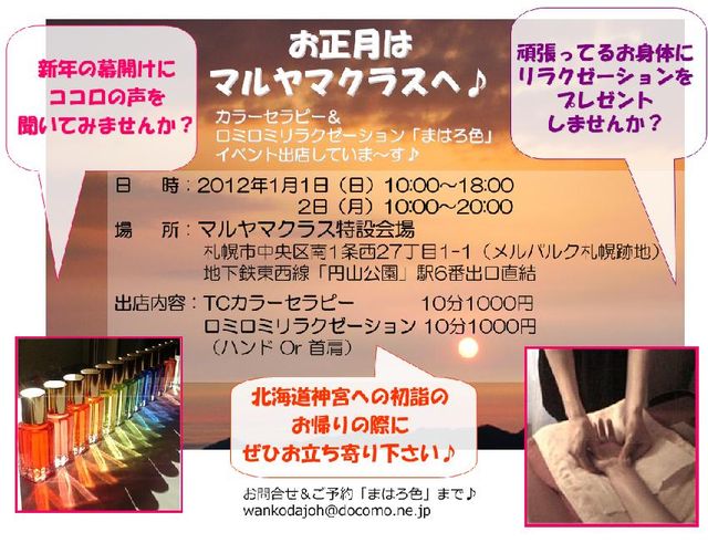 なんだかんだ鼻かんだと言ってるうちに もう年の瀬ではないですか! 早いですねぇ〜・・・ しじみしみじみ・・・ 年が明けたら そう! 皆でマルヤマクラスへGo!ひろみ郷! ********************************************** 「まはろ色」マルヤマクラスで出店しちゃいます ********************************************** 新年の幕開けにココロの声を 聴いてみませんか? 頑張ってるお身体に リラクゼーションをプレゼントしませんか? 日 時:2012年1月1日(日)10:00〜18:00
