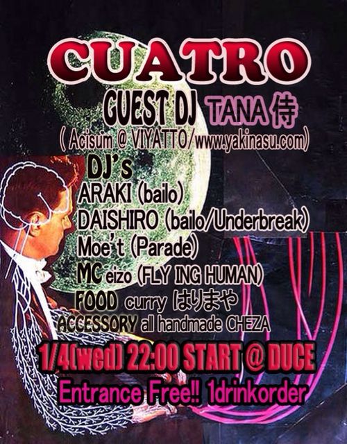 LineUP GUEST DJ TANA侍 (Acisum @VIYATTO / www.yakinasu.com) DJ's ARAKI (bailo) DAISHIRO (bailo・Underbreak) Moe't (Parade) MC eizo (FLY ING HUMAN) FOOD curry はりまや ACCESSORY all handmade CHEZA Infomation 22:00 OPEN/22:00 START ENTRANCE: Entrance Free!!! 1drink order(500yen)