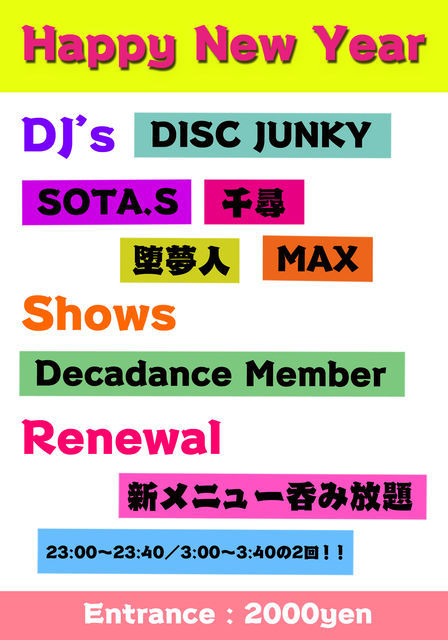 あけましておめでとうございます! 今年もやらしくね☆ みんな、初詣は済ませた?おせちは食べた?お餅も食べたかしら?? お酒も飲んでグータラ、、、ってヤダー!! 気がついたら体重が倍に!!! これはもうデカバーで踊りまくってダイエットするしか無いね!! って訳で新年会やっちゃうよー!! ビックリ企画なSHOWに豪華DJ! 何とTorture Garden JapanのSOTA.SやTokyo DarkcastleのDJ千尋も参戦!! クリスマスは450人!カウントダウンパーティーは280人!! たくさんの方にご来場いただきましたー! デカダンスもデカ