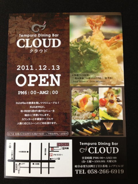 前回の猿カフェでのオフ会、なかなか好評でした オフ会楽しかったという声はもちろん、お店がよかったという声も多かったです ありがとうございます 今回はどうしようかな…またCaf Bar路線でいってみようか悩んでいたところに… 雰囲気のいいDining Bar見つけちゃいました 2011年12月13日リニューアルオープン、名鉄岐阜駅から徒歩10分圏内、 薄暗く大人なBARといった雰囲気のCLOUDで開催決定 大画面スクリーン、BARなのに天ぷら料理があるといったおス