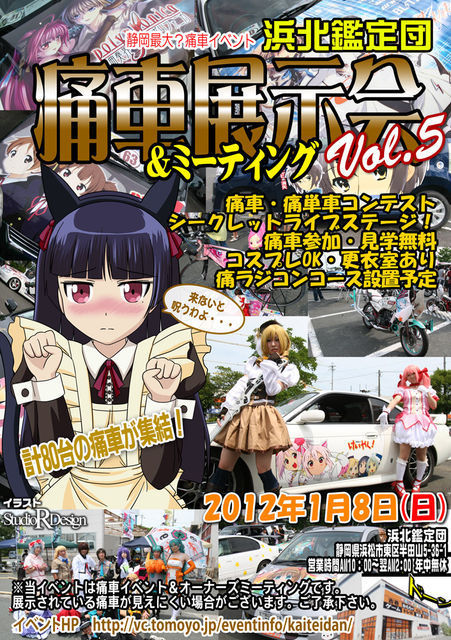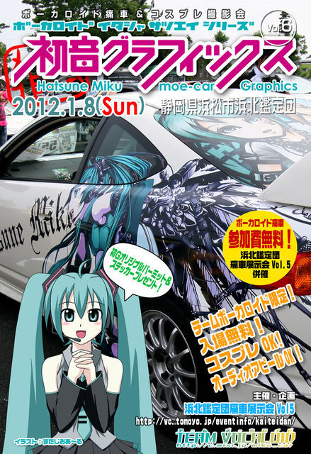 第5回 浜北鑑定団 エントリー受付開始されました! 今回も、TEAM VOCALOIDメンバー限定の【初音グラフィックス vol.6】同時開催になります! ※ 現在、二輪以外はキャンセル待ちの状態です。 下記リンク先『浜北鑑定団エントリートピック』より各自エントリー表明をお願いします。 ※ このトピに書き込んだだけでは鑑定団のエントリーにはなりません。 ※ 重要 ※ エントリー先に細かな注意事項が記載されています。 よく読んでトラブルの無いように願います。(特に排気音、オーディオなどの近隣住民への配慮等