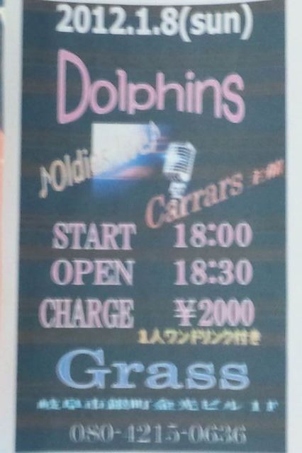 oldiesLive BAND Dolphins START18:00 OPEN18:30 Charge \2000-(1付) 場所Grass 岐阜市銀町金光ビル1FTEL 080 4215 0636 2012年 初LiveDolphinsさんの思いっきりお洒落して思いっきり60sを感じて盛り上がりましょう