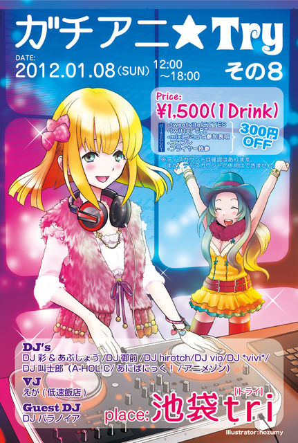 2012年一発目とあり、ガチ☆アニ初の昼間開催です!! 定番からマニアックな選曲まで幅広くお届けするアニソンクラブパーティー。 場所が池袋ということもあり乙女ロードにちなんで乙女パートもありますので女性でも楽しめます! もちろん!!男性人もオタゲ曲あり、最新曲もガッチリDJ陣が届けます。 お酒を飲みながら踊るのもよし 騒ぐのもよし新年そうそうから盛り上げていきたいと思ってます。 毎回おなじみの特集パートは.... 今回の開催日程でマクロスFのライブが当日でもありマクロスFライブ記念として 横浜会場に負け