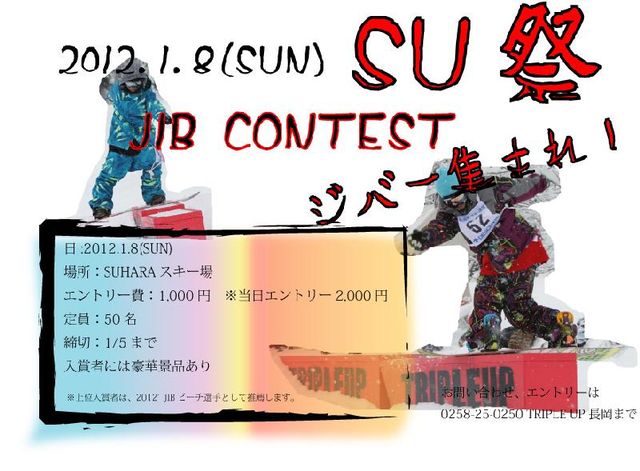 今年もやります! TRIPLE UP ジブコンテスト ジバー集まれ! 日時:2012.1.8(SUN) 9:00受付 場所:SUHARAスキー場 エントリー費:1,000円 ※当日エントリー2,000円 定員:50名 締切:1/5(木) 上位入賞者には、豪華景品あり!! 2012'JIBビーチ選手選考会もやります!! TRIPLE UP長岡店にてエントリー受付中