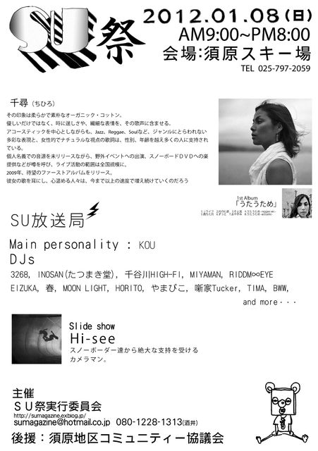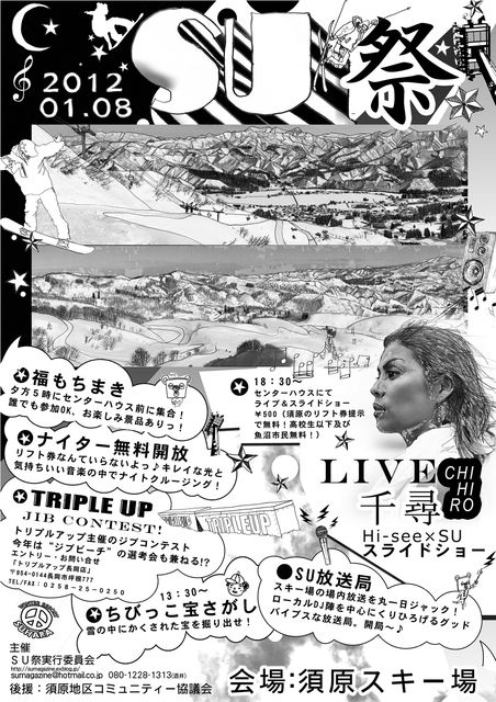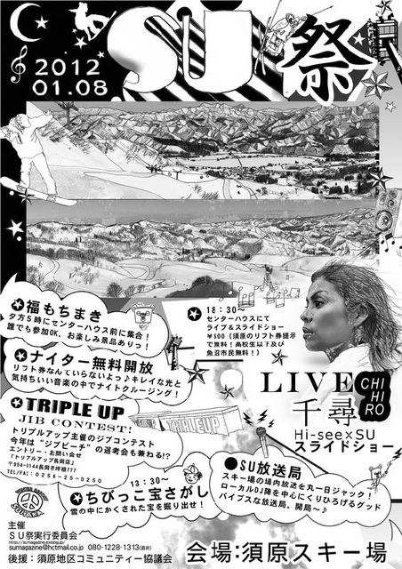 1月8日(日)須原スキー場にて冬の「SU祭」開催決定!! ◆場内放送ジャック(9:00~20:00) メインパーソナリティ:kou(nest) 地元DJと地域の皆さん?でラジオ風の場内放送 ◆TRIPLE UP ジブコンテスト(9:00〜12:00) ロマンスゲレンデにて開催 ジブビーチの予選会を兼ねています 問合せ:TRIPLE UP 長岡 ◆SUmagazine表紙撮影(ジブコンテスト終了後) ロマンスゲレンデにて、次号のSUマガジンの表紙撮影 スノーボード、スキー、スクート、そり、徒歩、どなたでも参加可能です ◆こども宝