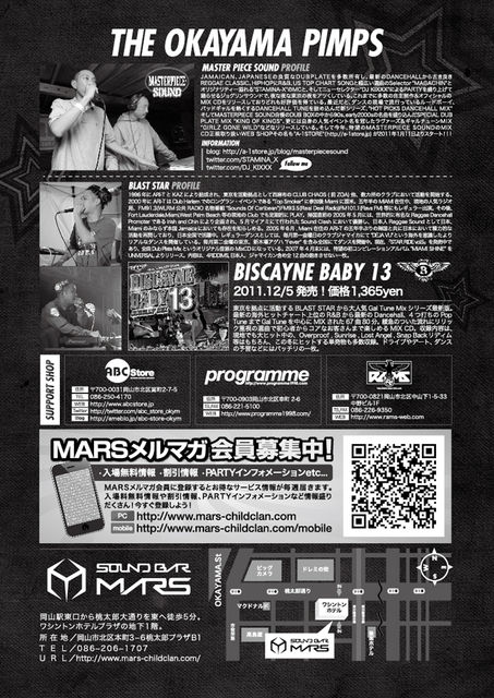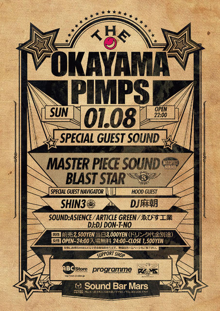 1/8(sun)22:00〜 THE OKAYAMA PIMPS SPECIAL GUEST SOUND:MASTER PIECE SOUND / BLAST STAR SPECIAL GUEST NAVIGATOR:SHIN3 HOOD GUEST:DJ 麻朝 SOUND:ASIENCE / ARTICLE GREEN / ゑびす工業 DJ: DJ DON-T-NO 【SUPPORT SHO】 ABC STUDIO/programme master work/RAMS 【料金】 ♂男性 前売2500円/当日3000円(ドリンク代金別途) ♀女性 OPEN-24:00入場無料/24:00-CLOSE 1500円 ≪お得なMARSメルマガ会員特典有ります。登録はホームページをご覧下さい。≫ http://www.mars-childclan.com ■開