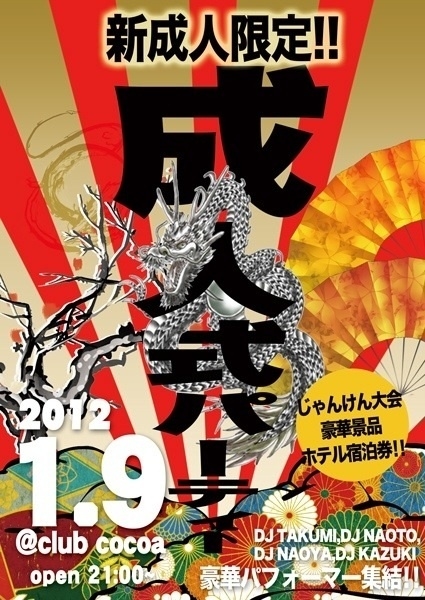 1·î9Æü(·î¡¦½ËÆü) À®¿Í¼°¥Ñ¡¼¥Æ¥£¡¼ (All Mix) 2012ǯÀ®¿Í¥Ñ¡¼¥Æ¥£¡¼!! ¥Û¥Æ¥ë½ÉÇñ·ô¤ä¹ë²Ú·ÊÉʤ¬Åö¤¿¤ë¤¸¤ã¤ó¤±¤óÂç²ñ ¤½¤Î¾¡¢¹ë²Ú¥Ñ¥Õ¥©¡¼¥Þ¡¼¤¬½¸·ë! ¼çºÅ&´ë²è¤Ï¿·À®¿Í! ¿·À®¿Í¤Ïcocoa¤ËÁ´°÷½¸¹ç!! open/start 21:00 Æþ¾ìÎÁ\1000 [Dj] Takumi Naoto Naoya Kazuki Ìä/0138-45-2002 club cocoa