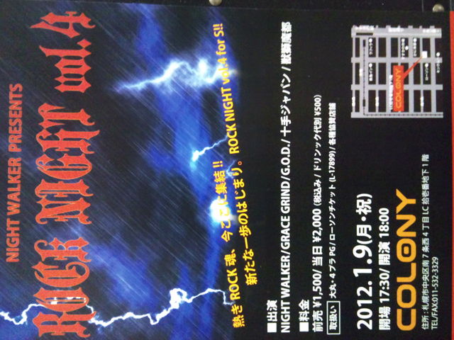 ¢£ROCK NIGHT vol.4 ¢£1/9(·î¡¦½Ë) @COLONY »¥ËÚ»ÔÃæ±û¶èÆî7¾òÀ¾4ÃúÌÜ LC½¦°íÈÖ´ÛB1F http://www.colony6.com/ OPEN17:30/START18:00 adv.\1,500/day.\2,000 ¢¨ALL 1Drink Order ¢£½Ð±é NIGHT WALKER/GRACE GRAIND/G.O.D./½½¼ê¥¸¥ã¥Ñ¥ó/½Ã»âËâÅÔ ¢£¼çºÅ NIGHT WALKER ¢£´ë²è/À©ºî XERO KREW ENTERTAINMENT ¢£¤ªÌ䤤¹ç¤ï¤» COLONY011-532-3329