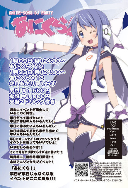 あにくら!×12 @川崎 club 月あかり夢てらす !!!開催日!!! 2012年01月09日 月曜 !!!開催時間!!! 開演 24:00〜 !!!入場料!!! 男性1,500 女性1,000 ※各2ドリンクサービス付 ※再入場可能(コスプレを着たままの外出はご遠慮ください) !!!イベント内容!!! あけましておめでとうございます☆ 今年も第二、第四月曜日はあにくら!に決めて! 憂欝な月曜日をぶっ飛ばせ! 週末にイベントが集中しているこのご時世。 平日だって遊びたい!!! 平日が休日の人もいるんだし! 平日に休み