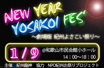 ホールならではの「音」と「照明」を駆使したライブ感満載のよさこい演舞が見所!! 日時:2012年1月9日(月・祝) (一部)14:00〜 (二部)15:50〜 ※開場は13:30〜となります。 ※入場無料 場所:和歌山市民会館小ホール 参加チーム:17チーム ※詳細はコチラから! http://www.kishu-yosakoi.jp/new-year-yosakoi-fes%27/ 主催:紀州龍神 協力:NPO紀州お祭りプロジェクト