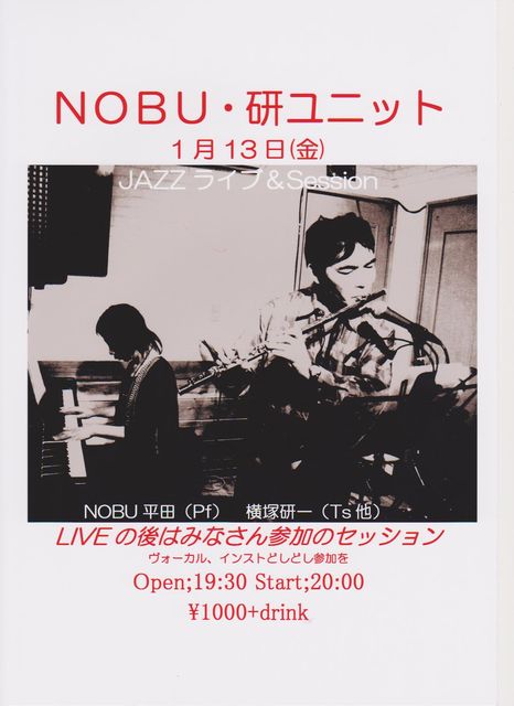 13日(金)Jazz NOBU・研ユニット LIVE & SESSION 1部:LIVE 2部:SESSION 楽器・ヴォーカル 皆さん参加です(初心者大歓迎) NOBU平田(Pf) 横塚研一(Ts他) Open;19:30 Start;20:00 ¥1000+drink