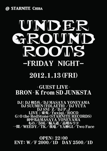 イベントの告知を失礼致します。 コアな音を求める全ての方に!! 千葉STARNITEにSD JUNKSTAからBRON-Kが初登場!! 2012.1.13(FRI) STARNITE presents UNDERGROUND ROOTS -FRIDAY NIGHT- @CLUB CHIBA STARNITE GUEST LIVE: BRON-K from SD JUNKSTA DJ: DJ 和5兵/DJ MASAYA YONEYAMA/DJ SUUMEN/DJ YUTA/DJ SNI-Z/DJ P.J LIVE: 東夷/fuxiqi/ROCO/G:O the RedStone(STARNITE RECORDS)/田中光&MASAYA YONEYAMA/もの/506/輪入道/高嶋ルリコ/一間/WEEDY/TK/我竜/YA柳GI/Two Face OPEN: 22:00 ENT: W/F 2000/1D DAY 2500/1D