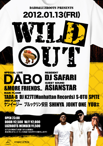 管理人様、貴重なスペース失礼致します。 2012年1月13日金曜日より南柏LUZROOTSにて、DABOのレギュラーパーティーが始まります!その名も「WILD OUT」!!そして、初回はDABOのSPECIAL LIVEがあります!ステージとお客様との距離が近いので、迫力のLIVEを味わうことが出来ます!RESIDENTにDJ SAFARI、GUEST SOUNDにASIANSTARと豪華なメンバーでお贈り致します。 遊びに来て下さる方は、ゲストとしてディスカウントでご招待させていただきますので、お気軽にご連絡下さい。お待ちしております。 LUZROOTS WEB http://luzroots.com/ DABO /