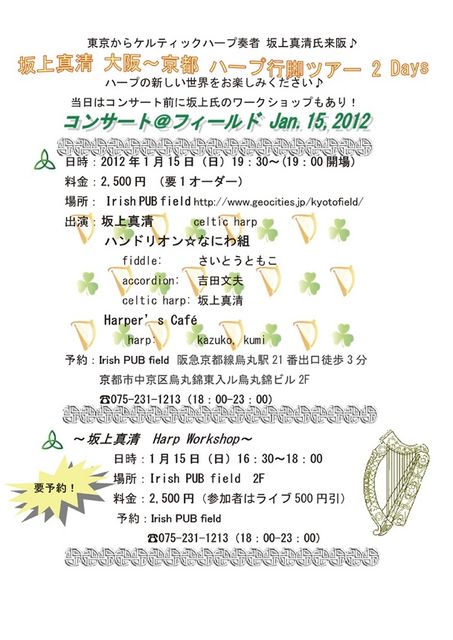 東京から金属弦ハーパーの坂上さん来版のご案内です。 今回は珍しく京都でハープのワークショップもあります。 【坂上真清 大阪〜京都 ケルティックハープ行脚ツアー 2Days】 1月14日(土) フィドル倶楽部 http://www.fiddle-club.com/ Open: 18:30 Start: 19:00 ・料金 前売り¥2,500、当日¥3,000 (+1オーダー要) 前売りはフィドル倶楽部 又は オフィスバンティングまで e-bunting_mss@pa2.so-net.ne.jp ・出演のミュージシャンに直接でも可(この場合は当日精算になります) ・出