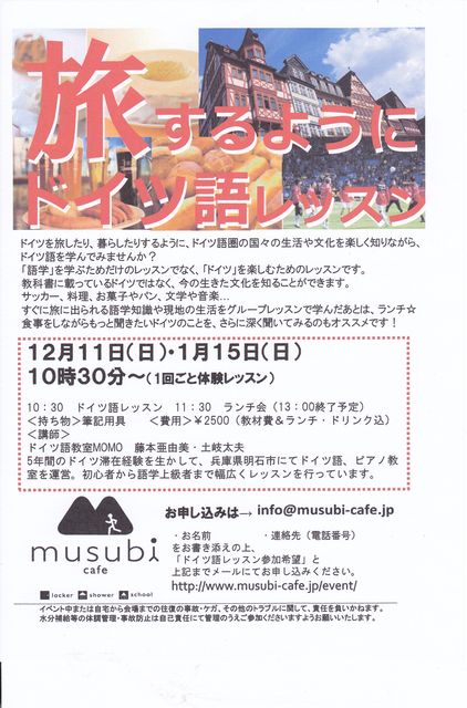 嵐山にあるジョグカフェmusubi cafeさんで「旅するようにドイツ語レッスン」を開催いたします ドイツ語圏の国々を旅しながら、生活や文化にふれながら楽しくドイツ語を学びませんか? 1時間のレッスンのあとはmusubi cafeさんのココロとカラダに優しいランチを頂きながら、みなさんで親睦を深めるStammtisch ドイツのいろいろな情報を交換しましょう ドイツ語のレベルは問いません。 お友達とご一緒にもちろんおひとりでもお気軽にご参加ください。 きっと素敵な出会いが広がりますよ 2012年1月15日(日