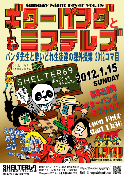 【eighty-one respects presents】 Sunday Night Fever vol.18 『パンダ先生と酔いどれ生徒達の課外授業 2012コマ目』 出演:ギターパンダ ミステルズ 場所:shelter69 http://www.69mfc.com/ 主催:eighty-one respects http://81respects.jugem.jp/ open 19:00 start 19:30 チケット 前売 2,500円 当日 3,000円 ギターパンダとミステルズの2マンLIVEが実現します。 チケットの予約はお店か私までメッセージで受け付けております。 よろしくお願いいたします。