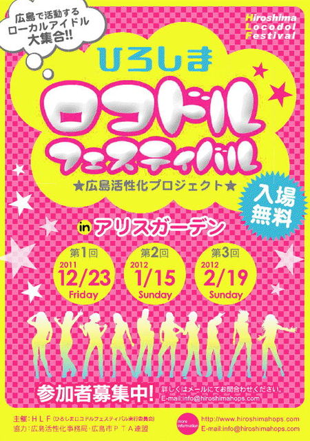 ★1月15日(日曜日)ひろしまロコドルフェスティバル開催! 広島のローカルアイドルをみんなで応援しませんか。 ひろしまロコドルフェスティバルはわくわくライフ広島まちづくりを合言葉に広島のまちを元気にしようと 活動している市民団体のひろしまおもしろパーソンズ広島活性化事務局が、まちに賑わいと活気をという思いで 地元で活動してるローカルアイドル達(ロコドル)やファンの方達に広島アリスガーデンに一同に集まっていただき日ごろ練習した歌やダンスパフォーマンスを元気いっぱい披露して広島のまちを明るく楽しく活気の