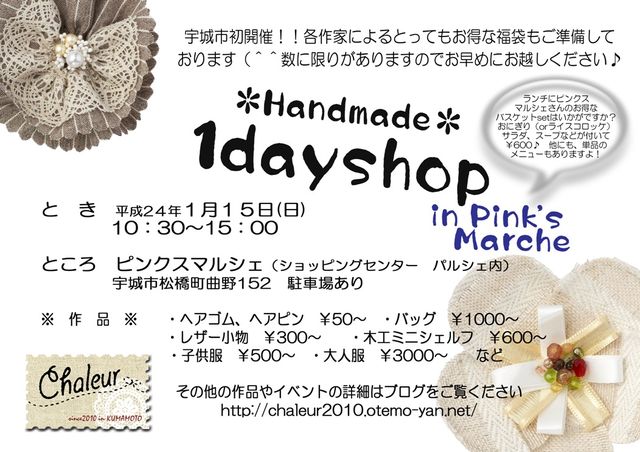 〜Chaleurの1dayshop〜 1月15日(日) 10:30〜15:00 宇城市松橋町 ピンクスマルシェ (ショッピングセンター パルシェ内) 今回は宇城市で初開催です! 作家による、と〜ってもお得な福袋をご用意してます! 数に限りがありますので、気になる方はお早めにお越しくださいね(^^ またピンクスマルシェさんでランチはいかがですか? お得なランチ、バスケットsetは、 おにぎり(orライスコロッケ、サンドイッチなど)、 サラダ、スープなどが付いて600円♪ 他にも単品メニューもありますよ(^^