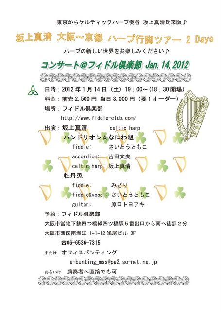 東京から金属弦ハーパーの坂上さん来版のご案内です。 今回は珍しく京都でハープのワークショップもあります。 【クローバー坂上真清 大阪〜京都 ケルティックハープ行脚走る人ツアー 2Daysクローバー】 1月14日(土) フィドル倶楽部 http://www.fiddle-club.com/ Open: 18:30 Start: 19:00 ・料金 前売り¥2,500、当日¥3,000 (+1オーダー要) 前売りはフィドル倶楽部  又は オフィスバンティングまで  e-bunting_mss@pa2.so-net.ne.jp ・出演のミュージシャンに直接でも可(この場合は当日精算になります) ・出