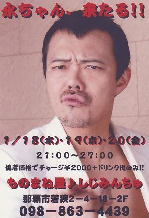 さて、今夜から【ものまね屋♪しじみんちゅ】は仕事始め そして、1月のゲストの発表です 矢沢永吉さんの歌マネ&顔マネそっくりさんの【永 雅実】氏を迎えて18日から3day's演っちゃいます 何を隠そう、今から11年前に生き別れた、アタシの元ダンナでR 結婚当時の暴露トークはあるのか… 犬も喰わない、元夫婦喧嘩は勃発するのか… 怖いモノ見たさな御奇特な方、是非目撃しにいらしてください 御予約承り中です 【ものまね屋♪しじみんちゅ】 那覇市若狭2-4-