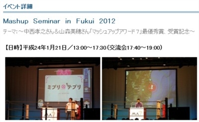 ━━━━━━━━━━━━━━━━━━━━━━━━━━━━━ 技術者向けイベント「Mashup Seminar in Fukui 2012」 〜福井県勢ミブリ・テブリ「MA7」最優秀賞、受賞記念〜 ━━━━━━━━━━━━━━━━━━━━━━━━━━━━━ 公益財団法人ふくい産業支援センターでは、この度開催されました、 国内最大のウェブアプリケーション開発コンテスト 「Mashup Awards 7 (マッシュアップアワード・MA7)」において、 見事に最優秀賞を獲得されました福井県勢「ミブリ・テブリ」の 受賞記念としまして、今年も例年同様1月後半(21日)に