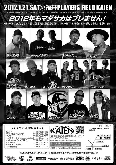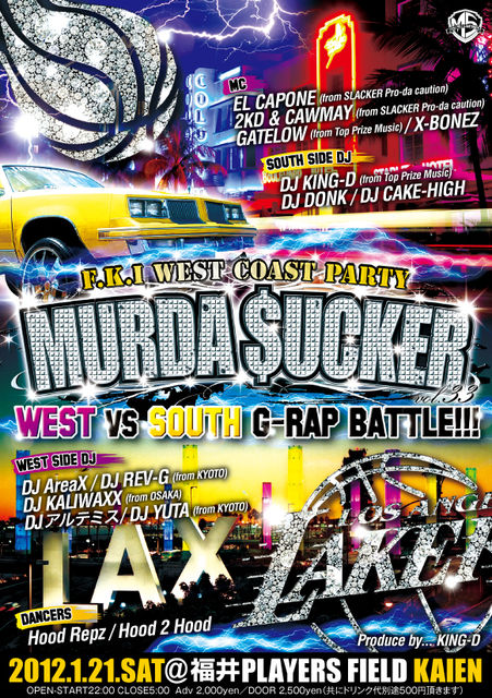 2012年もマダサカはブレません! HIP-HOPは文化です! 今回は西と南に焦点をしぼり、 GANGSTA RAPを187%感じて欲しいと思います! F.K.I. WEST COAST PARTY... 【MURDA SUCKER vol.33】 WEST vs. SOUTH G-RAP BATTLE!!! 2012/01/21(SAT) 福井@PLAYERS FIELD 【KAIEN】 OPEN-START/22:00 FINISH/5:00 Adv.2,000yen DOOR/2,500yen (共にD別) ■MC■ 2KD & CAWMAY (from SLACKER Pro-da caution) EL CAPONE (from SLACKER Pro-da caution) GATELOW (from Top Prize Music) X-BONEZ ■DANCE■ Hood R