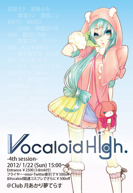 初音ミクを代表とする歌声合成ソフトウェア “VOCALOID” 毎日のように動画サイトに新曲が公開され、今や10万曲を越えるとも言われる"楽曲" 楽曲のPVに留まらない、イラストやMMDなどのボーカロイドの世界を演出する"映像" 二次創作を中心に、既存のキャラクターでは最大級の種類となるであろう"衣装" 更に進化したVOCALOID3の登場、増えるキャラクター達 Los AngelesにGoogleに!? どんどん広がるVOCALOID WORLD! そんな魅力いっぱいのボーカロイドを愛し過ぎちゃった人たちが 集まって"表現"するクラブイベント! 【Vocaloid High