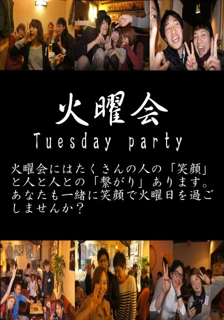 管理人様失礼します。 新年一発目、今年も火曜会やりますよー!(^-^)/ 今回で八回目ですが、初めての方大募集です(^^)トピックに書き込みずらければメッセージくださいねー(^-^)/毎回半分くらいは初参加の方となってますので安心してくださいね(^^) 火曜会とは、なんぞやと思った方は↓まで読んでね! 会の様子は http://photo.mixi.jp/view_album.pl?album_id=500000040907376&owner_id=36702707 で写真を見てみてください! オシャレオフ会に参加して人脈を広げてみたい!!!けど土曜、祝日仕事で行けない。。 と