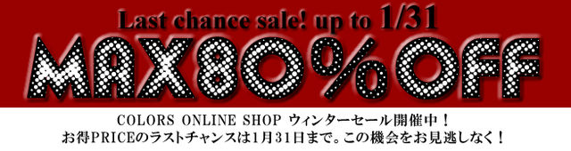 ≫http://www.colors-shop.com/ 只今開催中のウィンターセール。 お得なプライスもラストウィークになっています!! 今のプライスでのご紹介は1月31日ご注文分まで! 春先まで使えるアイテムもたくさんなので、この機会に是非チェックしてみて下さい〜♪ COLORS ONLINE SHOP http://www.colors-shop.com/ COLORS MOBILE SHOP http://colors-shop.com/m/ COLORS BLOG http://colorsw.exblog.jp/ E-MAIL:colors@ucce.jp 【実店舗】 Garland shop in shop UNDER COVER hiroshima (ガーランドショップインショ