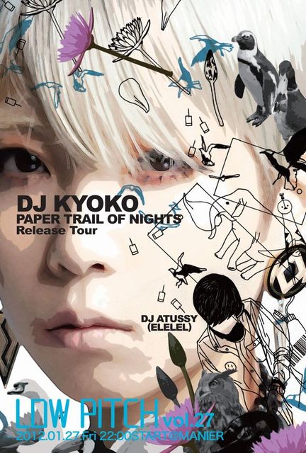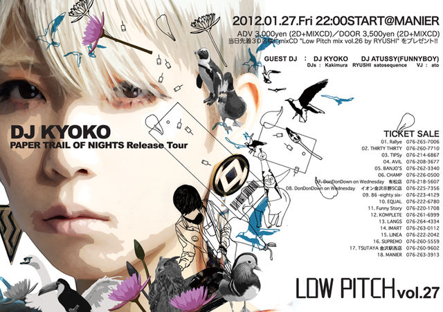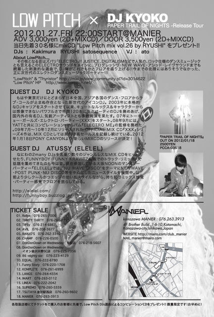 2012/01/27(FRI) "Low Pitch" × "DJ KYOKO" PAPER TRAIL OF NIGHTS -Release Tour @ MANIER GUEST DJ : DJ KYOKO DJ ATUSSY (ELELEL) OPEN: 22:00〜 ENTRANCE FEE: ADV:3000yen (2D+MIXCD) DOOR:3500yen (2D+MIXCD) ※当日先着30名様にmixCD "Low Pitch mix vol.26 by RYUSHI" をプレゼント!! DJs : Kakimura RYUSHI satosequence VJ : ato TERU TICKET SALE: 01. Rallye 076-265-7006 02. THIRTY THIRTY 076-260-7710 03. TIPSy 076-214-6867 04. AVIL 076-208-3677 05.