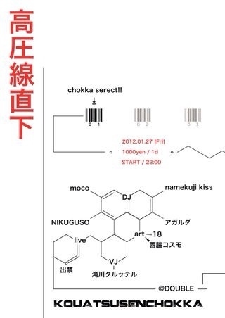 ド変態友達のdj mocoが主催するハイパードメスティックなイベントです。 出演者全員ド変態なので何が起こるかわかりません。 そして僕もnamekuji kiss[ナメクジキッス]として出るのでよろしくお願いします。笑 2012.1/27(FRI) at DOUBLE OPEN/START 23:00- DOOR:1000yen(1D) 高圧線直下 ■DJ moco namekuji kiss≪≪ NIKUGUSO アガルダ ■VJ 滝川クルッテル ■LIVE 出禁 ■ART 18 西脇コスモ 【INFO】 @ DOUBLE(FREEDOMHALL) 石川県金沢市方町