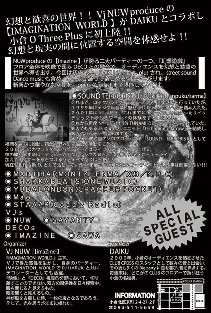 小倉O Three Plusに初上陸!NUWproduceの【Imazine 】の誇る二大パーティー、『幻想遊戯』フロア全体を映像で囲みDECOとの融合で、オーディエンスを幻想と歓喜の世界へ導き出す。今回は初の試み、DAIKU の感性もplusされ、ストリートsound,dance music も含め、みんなが踊って楽しめる空間が広がります。斬新なopen からlast までのストーリーを感じてみて下さい。