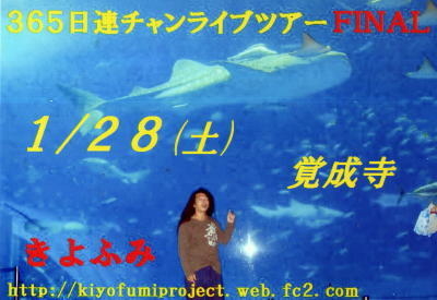 2011年4月1日から始まった、シンガー・きよふみさんの『365日連チャンライブツアー』。 いよいよツアー大詰めを迎えるきよふみさんが覚成寺に帰ってきます☆ 本堂でのアンプラグドライブ♪ のんびりまったり たのしみましょ〜☆☆☆ ■日時・・・2012年1月28日(土)よる8時〜 ■きよふみさんのホームページ http://kiyofumiproject.web.fc2.com/